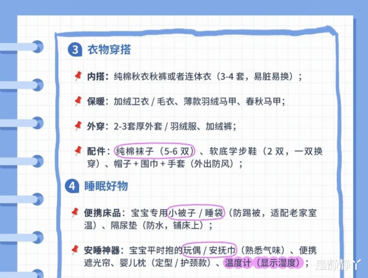 临了,还有一个“随身包”要单独整理,放在车里或者随身挎包里。内部要装上宝宝的证件,比如出身证据或者户口本。再带上一些便携玩物、宝宝绘本,还有他心爱的动画片,这些齐是哄娃的“神器”。清洁类的,小包婴儿湿巾、云柔巾、拉拉裤、隔尿垫,这些齐要备上。