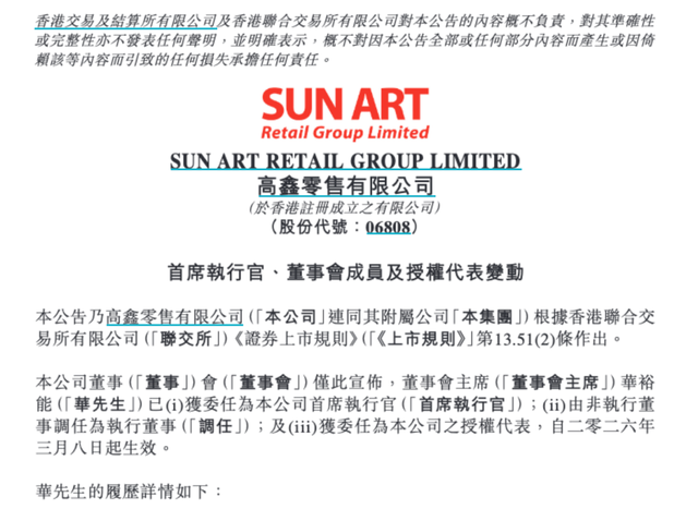 3月8日,高鑫零卖公告称,董事会主席华裕能已获委任为公司CEO;并由非实行董事调任为实行董事;自3月8日起成效。