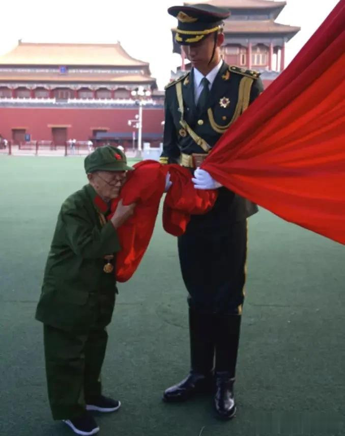 2019年,95岁的李安抚受邀去天安门看升旗仪式。当国旗缓缓升起、国歌奏响,仪式结束后,老人颤抖着伸出手,轻轻亲吻着国旗,眼泪止不住地往下流。这一吻,是他对当年参军时誓言的兑现,更是一个老英雄对祖国最深情的告白。