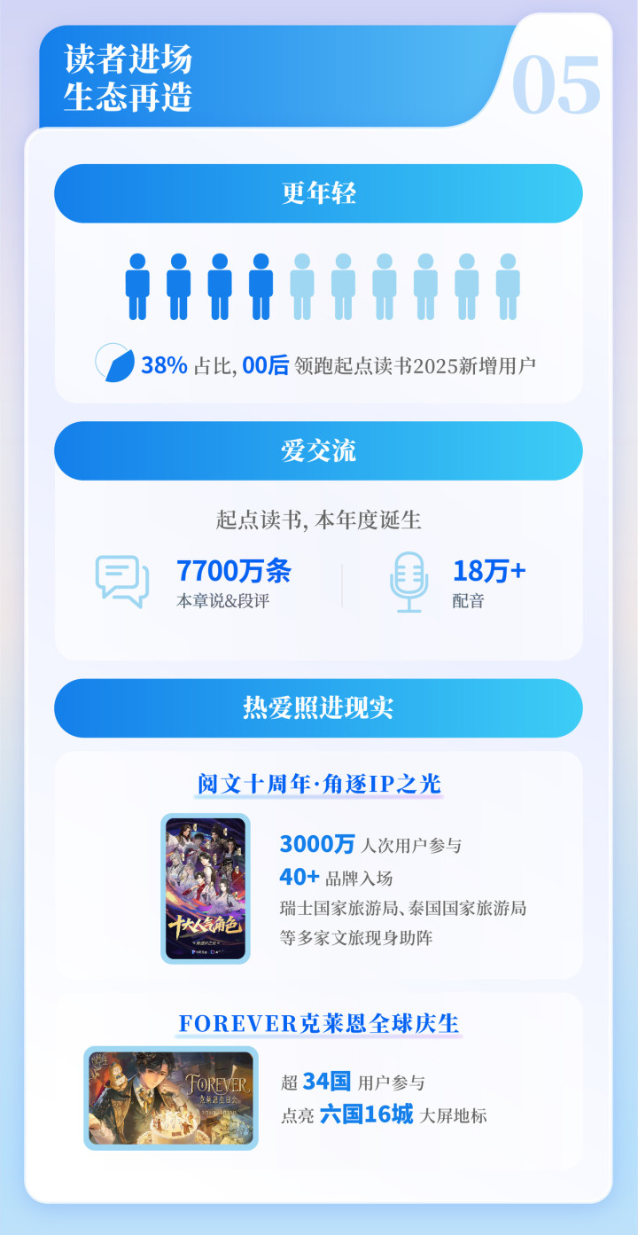 数据显现,早先念书2025出身了7700万条“本章说”与段评、超18万条作品配音。从普通的互动,到“阅文十周年·角逐IP之光”的3000万东说念主次参与,再到“FOREVER克莱恩全球庆生”阴私34国用户、点亮六国16城大屏地标,读者已成IP生态的深度共创主体。