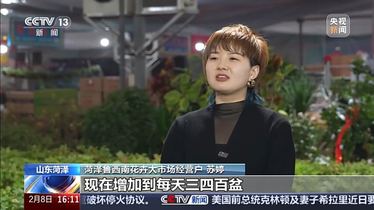 菏泽鲁西南花卉大市场经营户 苏婷:临近春节,销量从往常每天的一二百盆增加到三四百盆。
