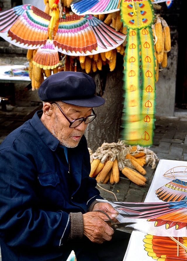 潍县寒亭杨家埠,是寰球三大年画产地之一,亦然潍坊风筝制作“大厂”,全村千号东说念主,五百印年画,五百扎风筝。其代表东说念主物杨同科,十岁学艺,十一岁运转扎风筝、画风筝,一直干到九十多岁。他制作的风筝,大到三百六十米长的龙头蜈蚣,小到洋火盒大小的蝴蝶,扎制、绘图皆雅致逼真,东说念主称“风筝王”。