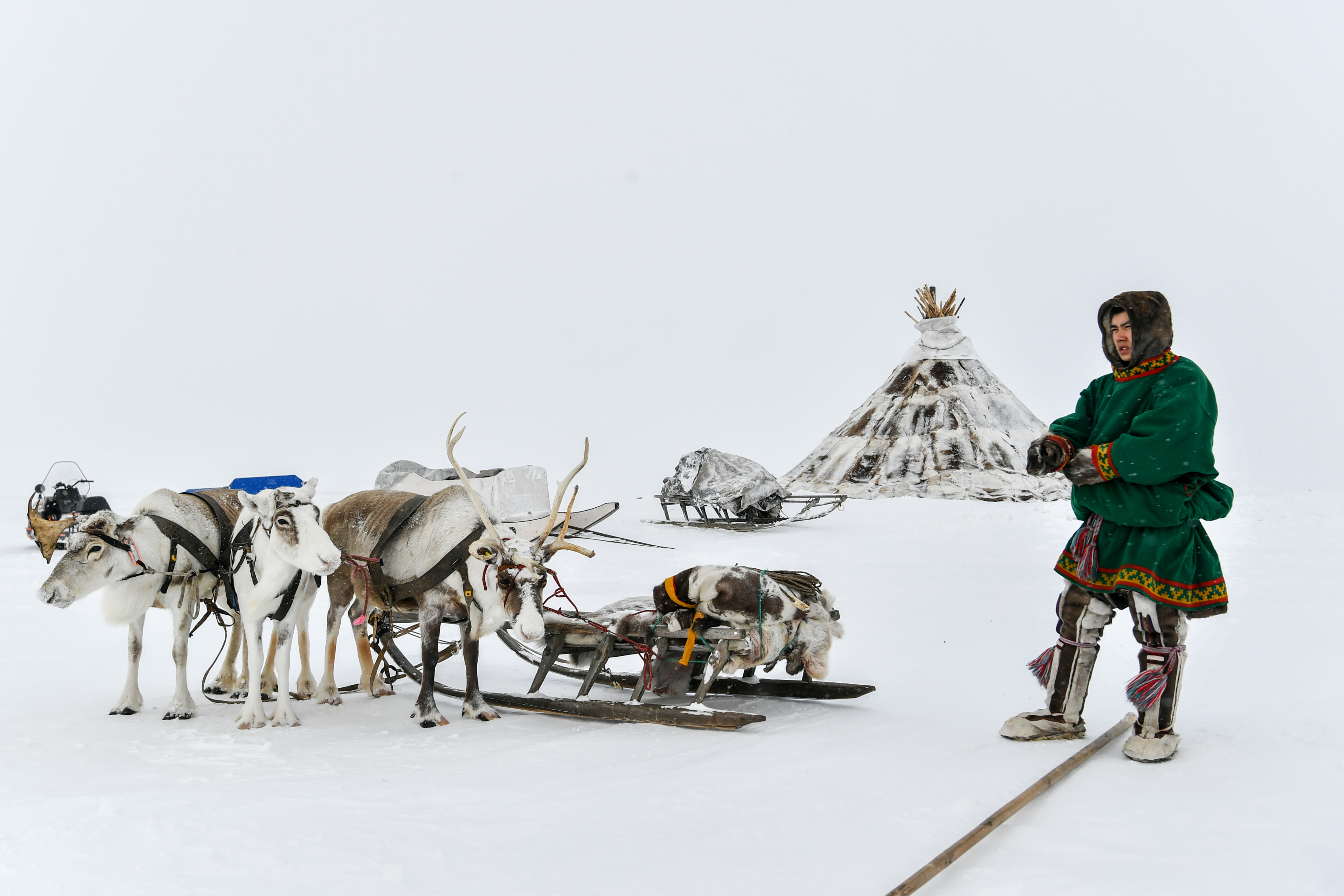 2023年4月7日,在俄罗斯亚马尔-涅涅茨自治区,一名涅涅茨男子站在自家帐篷前。新华社记者曹阳摄