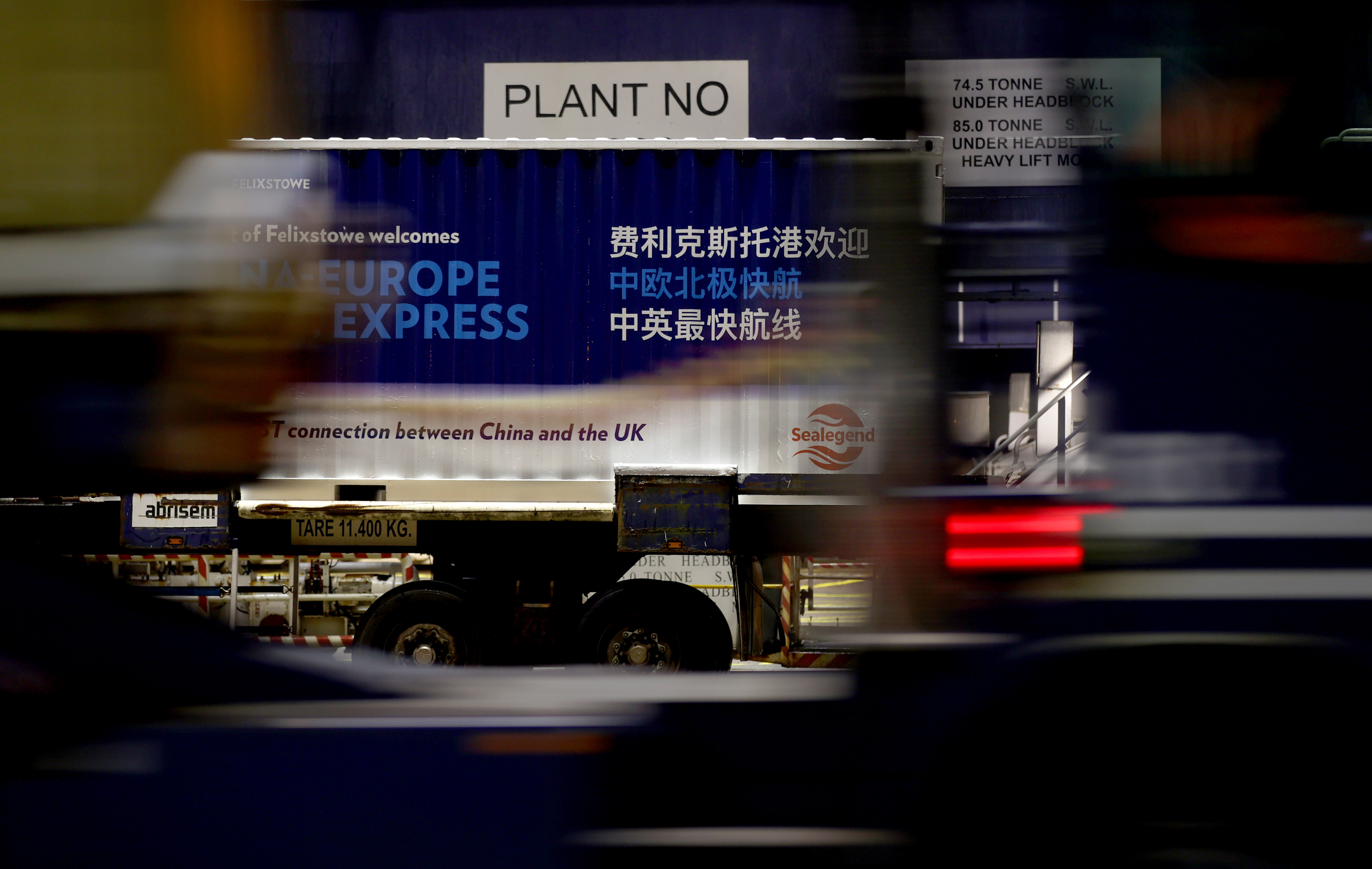 这是2025年10月13日在英国费利克斯托港拍摄的印有“费利克斯托港欢迎中欧北极快航”字样的集装箱。新华社记者李颖摄