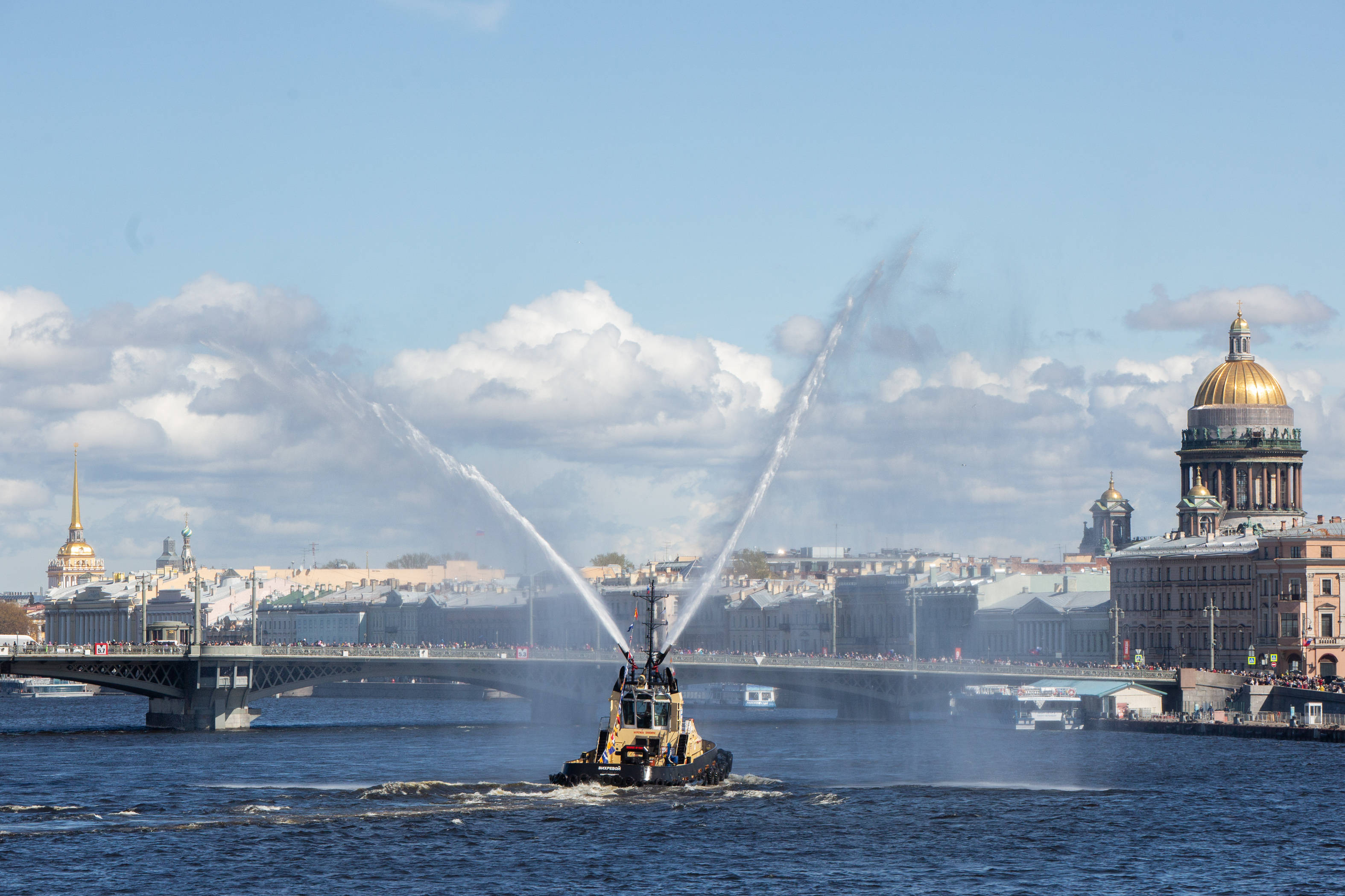 2025年5月3日,拖船在俄罗斯圣彼得堡涅瓦河上表演破冰船节的标志性活动——“水上华尔兹”。新华社发(莫京娜摄)