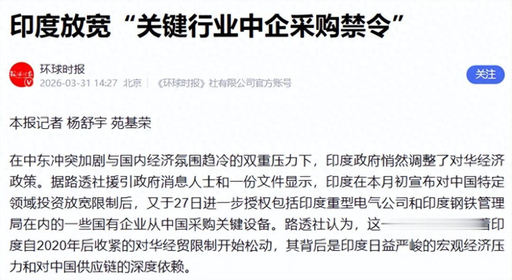 2026年3月27日,印度政府悄然放宽部分国有企业从中国采购要害建筑的限度。