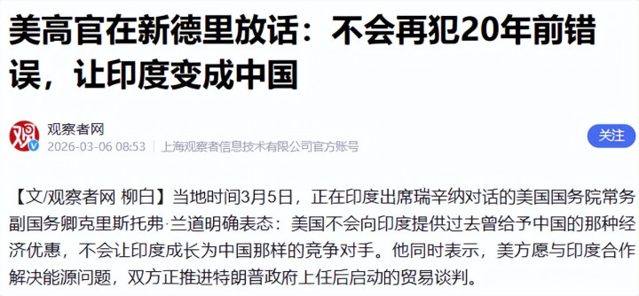 2026年3月5日,好意思国国务院常务副国务卿克里斯托弗·兰说念在印度明确表态,好意思国不会向印度提供已往曾予以中国的那种经济优惠,不会重蹈20年前对华策略覆辙。