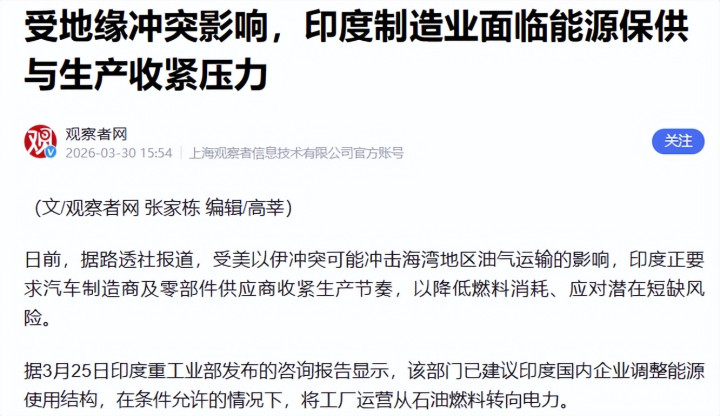 2026年3月25日,印度重工业部发布规划倡导,建议企业颐养动力结构,条目允许就从石油燃料转向电力。听上去像转型,其实是缺油缺气下的被迫搪塞。