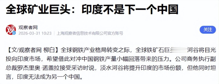 西方成本对印度的情怀变化也很执行,2026年3月30日,淡水河谷高管对彭博社坦言,印度注定无法成为另一个中国。